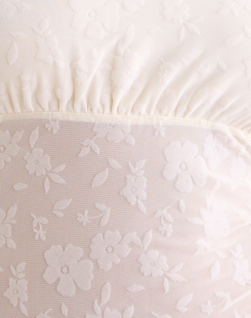 The Aqsa top in cream floral flock print on a flocked mesh fabric base. Long sleeve style top with square neckline, slightly flared sleeve and ruching around the bust. Bust is fully lined and finished with a lettuce hem on the sleeve and hemline. Style with our Nidya mini skirt.