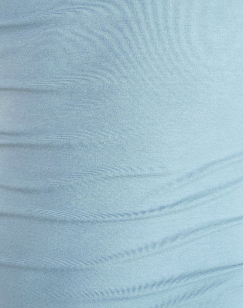 The Bunga top in nantucket blue rayon jersey fabric with chocolate binding around the neck. Short sleeve t-shirt style top with flower ring detailing on the chest. Style with a denim mini skirt.