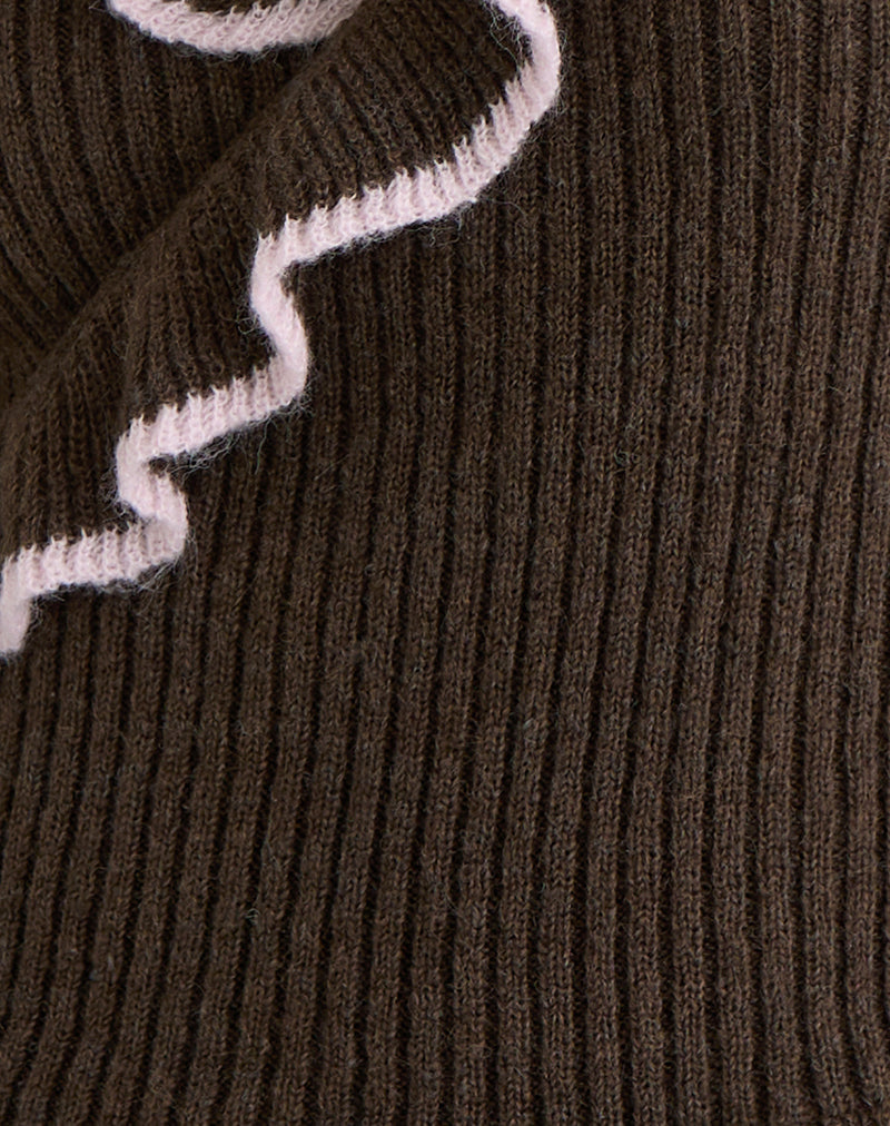 With a chunky knit material, the Christella top in dark chocolate has long sleeves, and a v-neck, finished with light pink ruffles around the neckline and the hem and sleeves. Style with a pair of Parallel jeans.