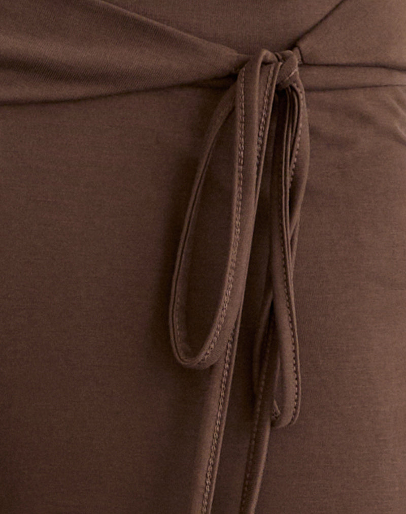 The Donata trousers in a dark brown cupro fabric feature a wide-leg style with a fold-over waistband. Complete with belt-like detail with a tie on the left-hand side for an adjustable finish. Style with the matching Prilla top.