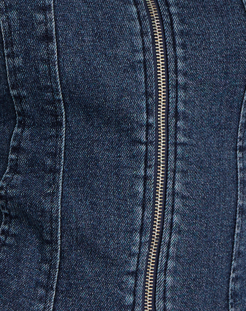 The Dunya top is a fitted zip-through denim top in vintage blue denim, featuring raglan sleeves, contour seaming, and delicate frill trim detailing. Designed with a regular-length fit and classic crew neckline. Style with our matching Lupi skirt.