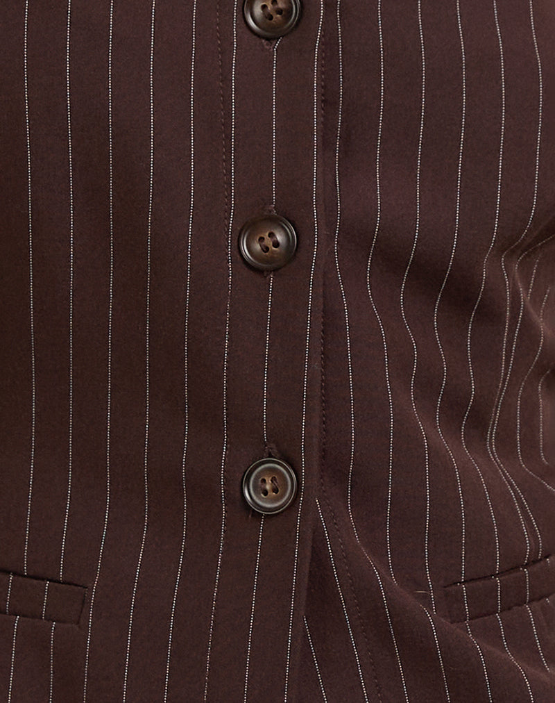 The Ganita vest in a dark brown pinstripe. Featuring a scoop neckline and thick straps. Designed with a functional centre-front button opening, and complete with a tight fit.