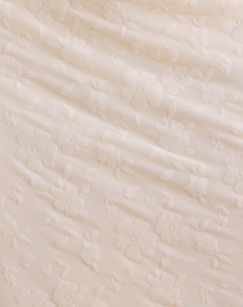 Gerda dress in cream floral flock print on a flocked mesh fabric base. Maxi style dress with plunge neckline and sleeveless fit. Finished with a lettuce edge on the hem. Dress is fully lined.