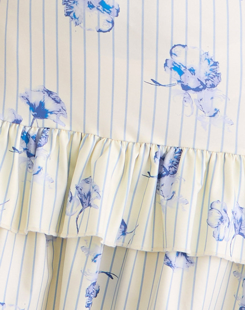 The Sitav dress in floral stripe cream in a jersey fabric. Complete in a bandeau mini style with two tier ruffle hem.